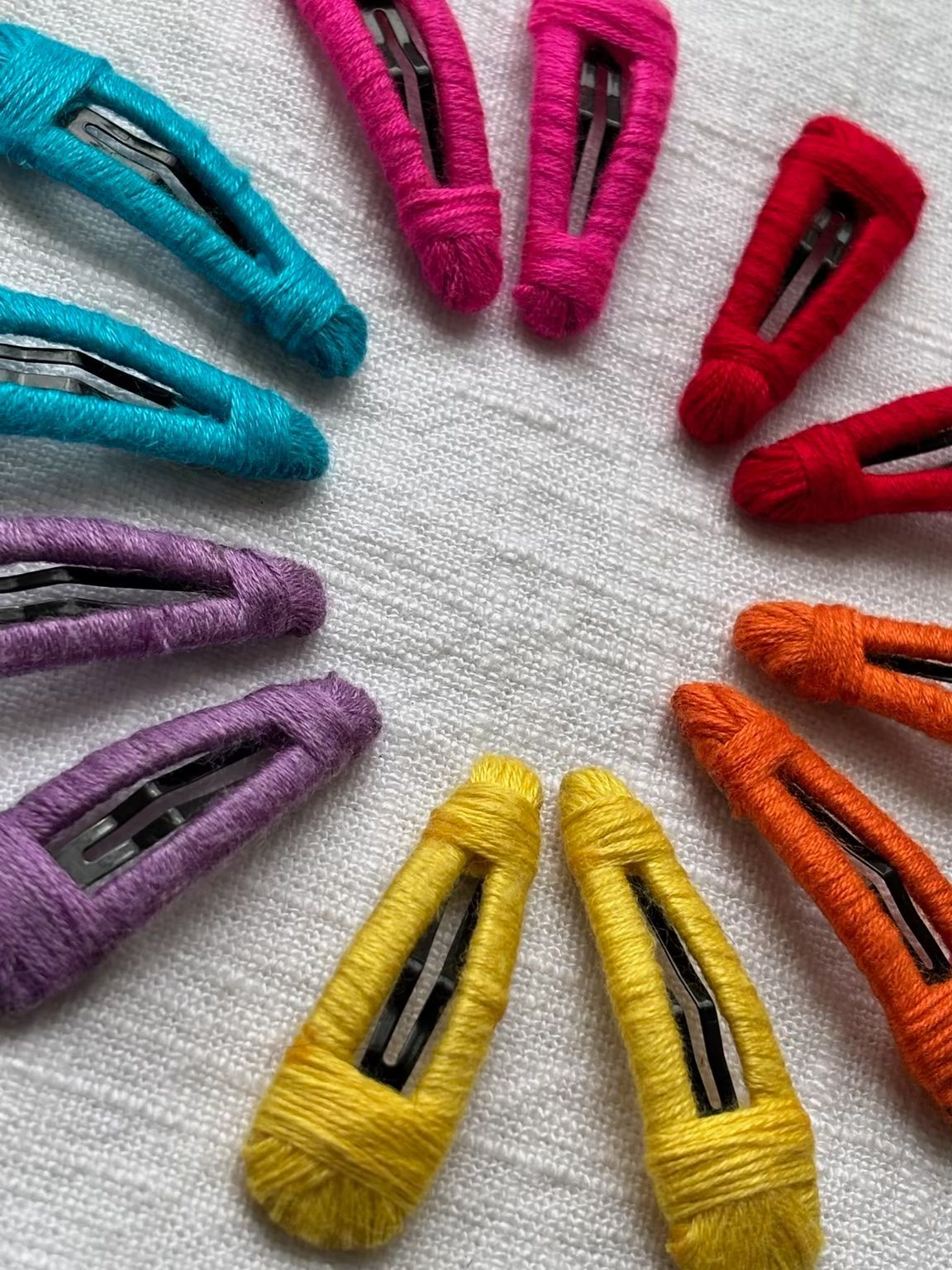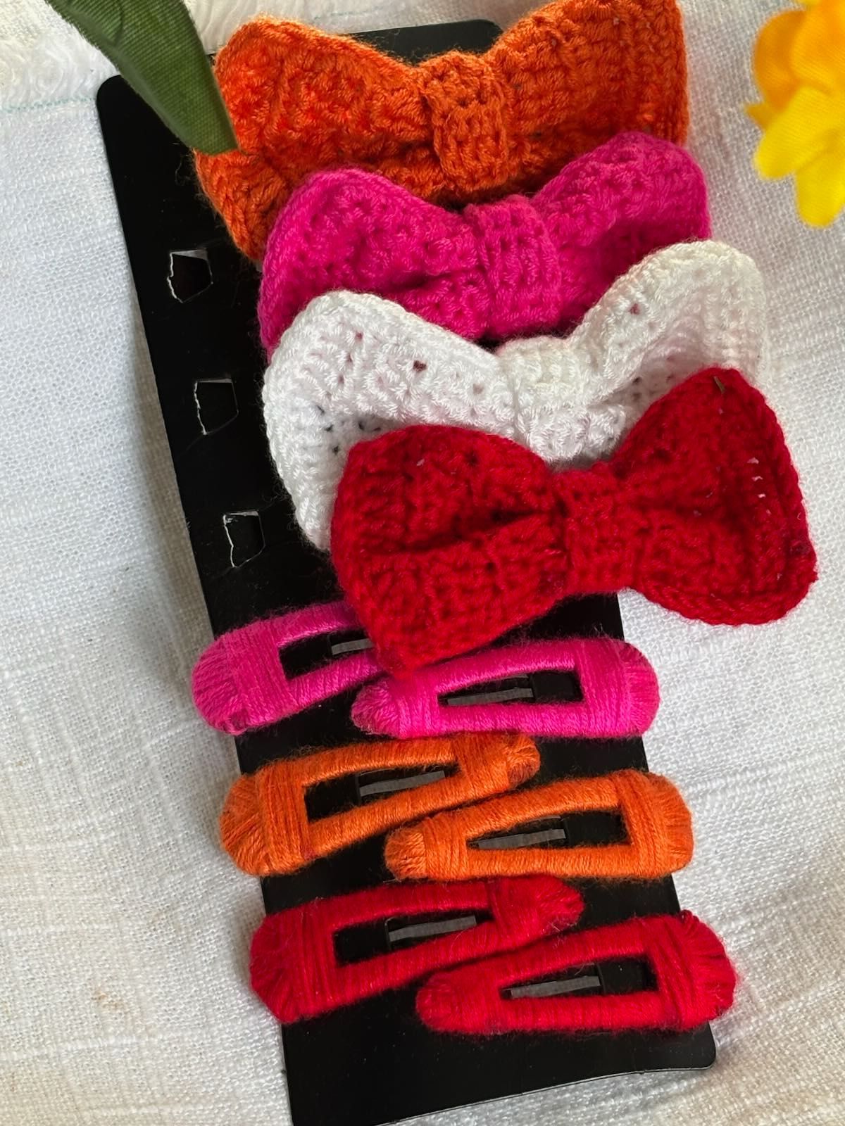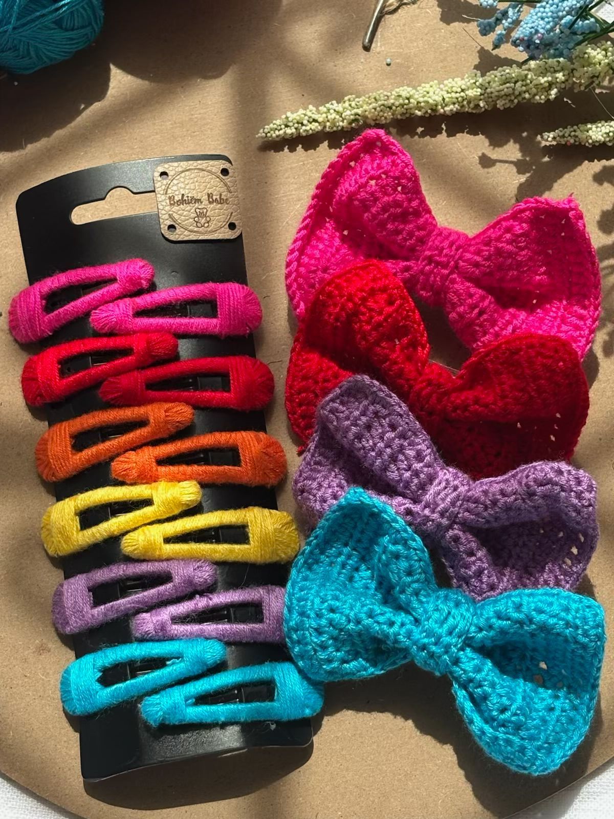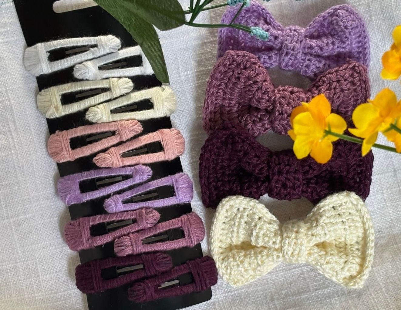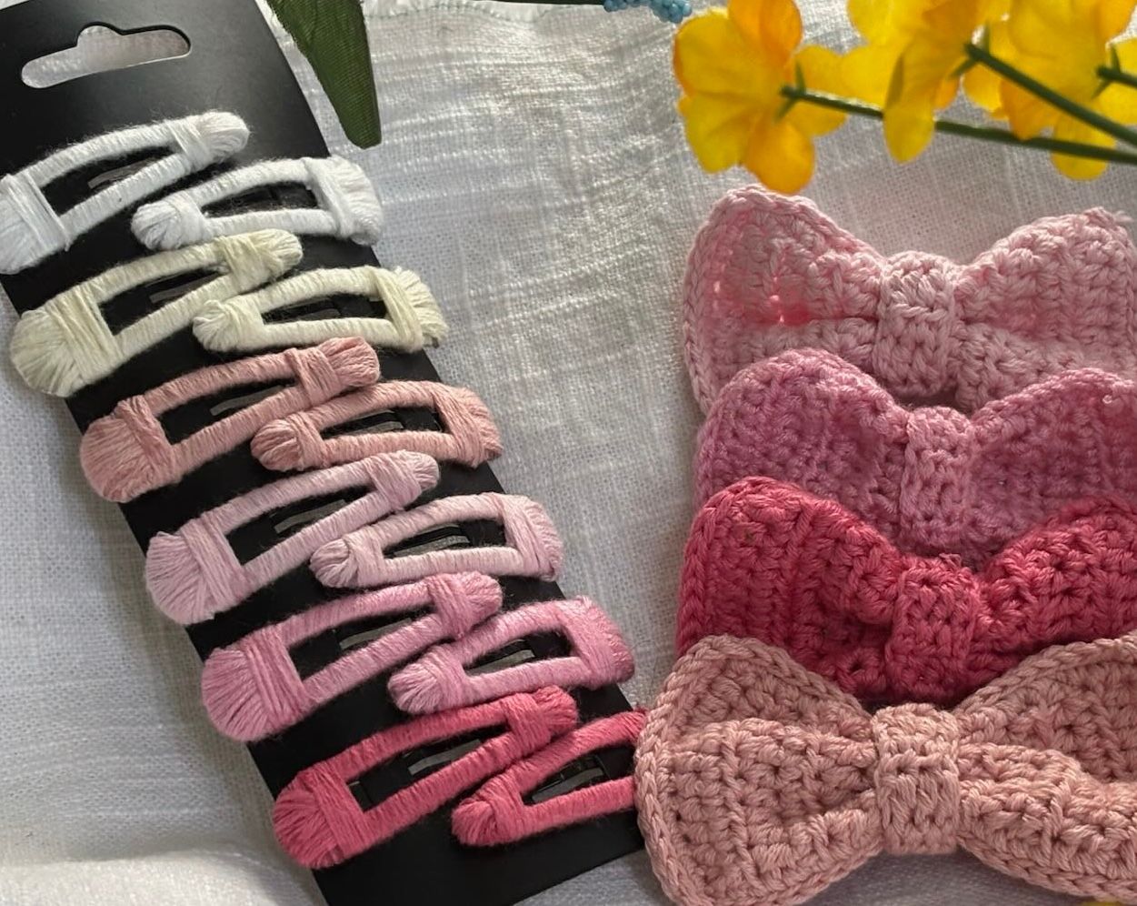 Each piece is hand-crocheted and hand-wrapped in a smooth cotton blend, offering a gentle, secure hold while maintaining a soft, refined feel. The bows introduce subtle structure and dimension, while the matching clips create balance — forming a complete, harmonious pairing.
