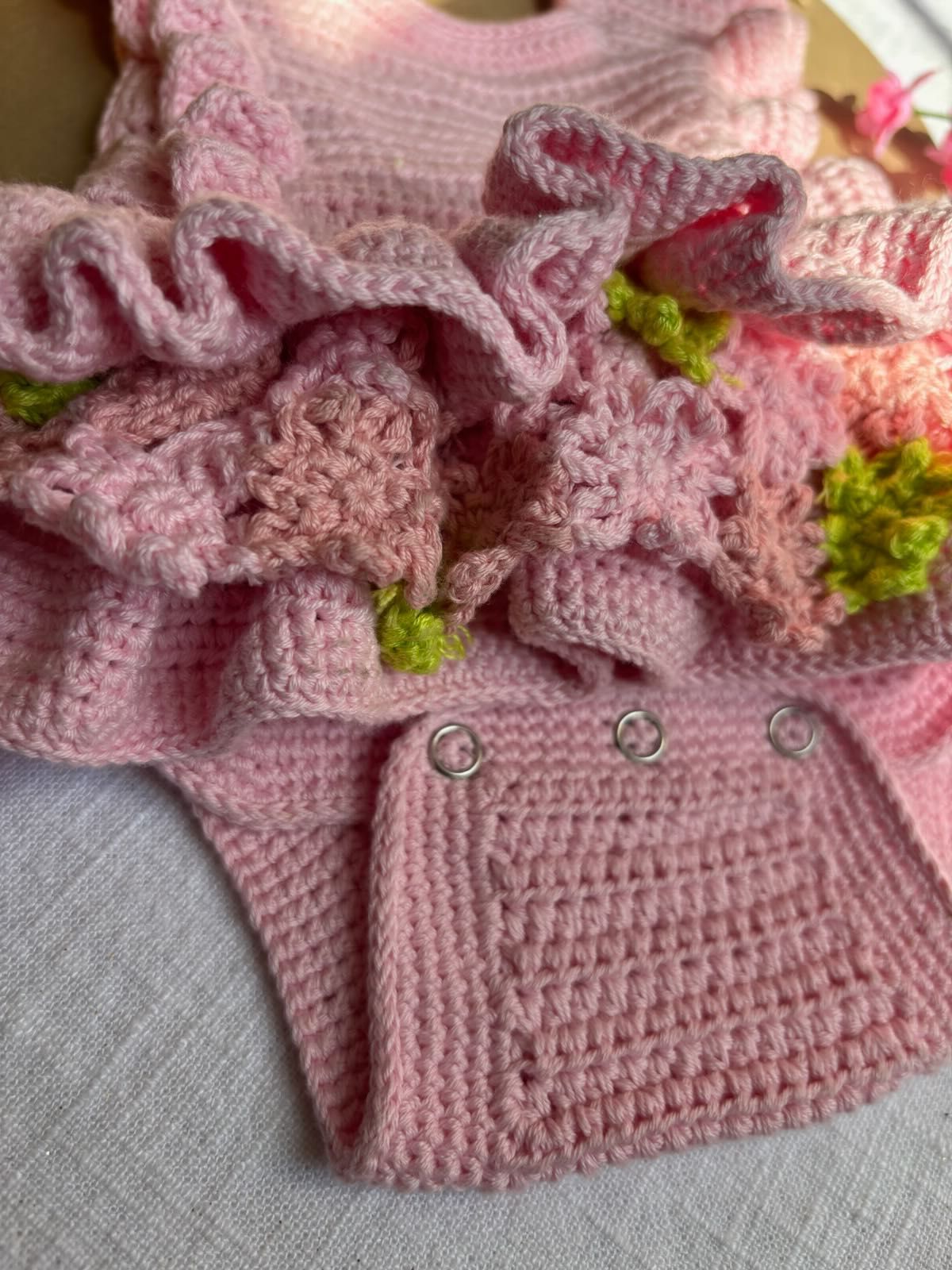 Hand-crocheted in gentle, cotton/bamboo blend, this piece is inspired by garden mornings and the softness of petal bloom. The textured bodice offers timeless foundation, while subtle ruffles sleeves add a touch of effortless charm.